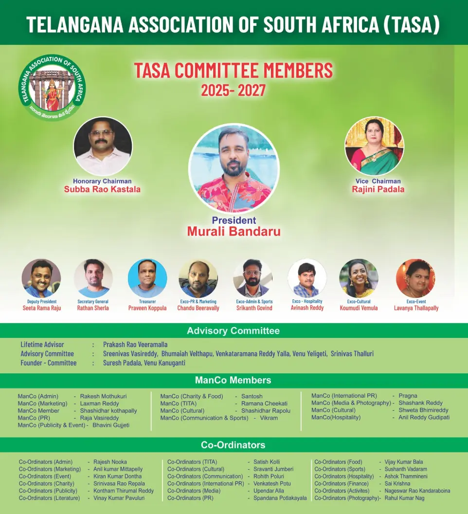 TASA is a non-profit organization, we extend a warm welcome to all Telugu speaking people to an open and inclusive platform where the focus will be on Telugu language, arts with primary vision of providing Charitable, Community, Cultural and Social services in Republic of South Africa and Telangana Region.